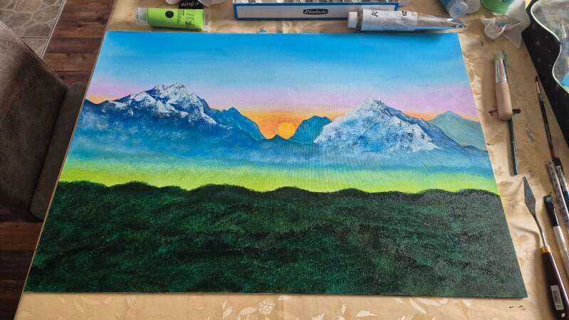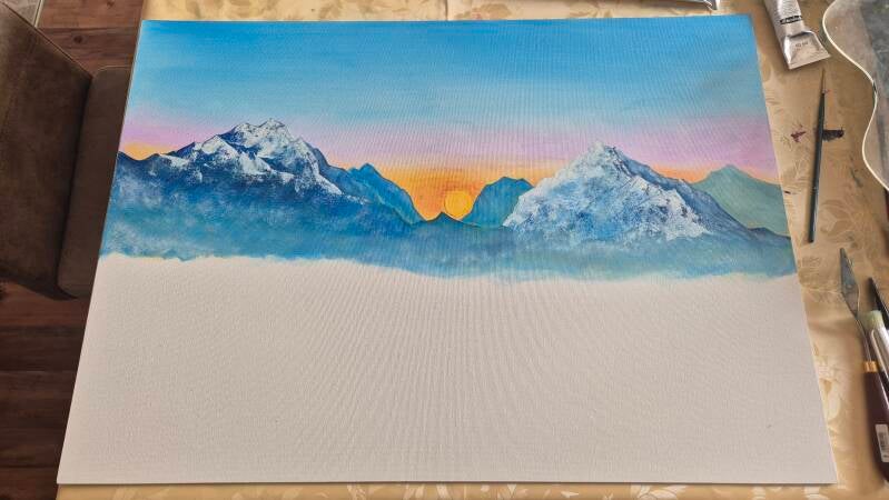 Urplötzlich jedoch stand irgendwie alles still. Ich hatte mir ein Zeitfenster geschaffen und alles vorbereitet. Der Tisch war mit einer Plane geschützt, die Farbtuben und Pinsel lagen bereit. Ich stand vor der Leinwand und war einfach nicht in der Lage anzufangen. Dabei hatte ich mich so darauf gefreut. Ich fragte mich, was um alles in der Welt hier los ist.