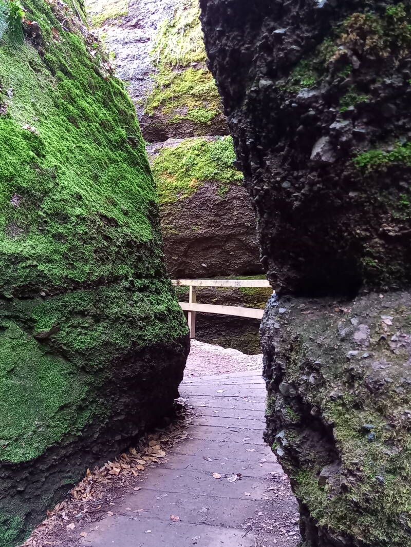 Zu Beginn ist die Schlucht noch relativ breit, man läuft entlang eines rauschenden Baches. Nach und nach verengen sich die Felswände und bilden schließlich eine Klamm, die stellenweise nur hüftbreit ist. Über Gitter und Holztreppen schlängelt sich der Pfad zwischen moosbedeckten Felswänden hindurch.2)