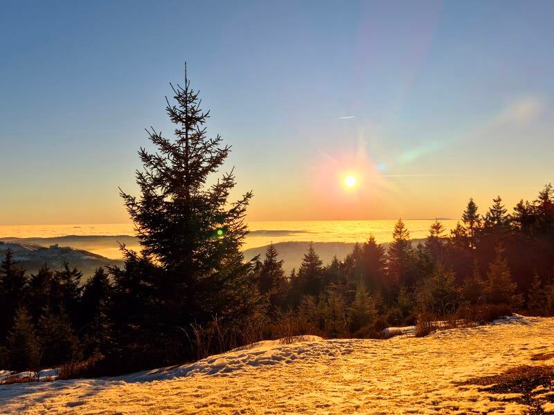Besonders spektakulär konnte man hier den Sonnenuntergang am 17. Januar 2025 genießen. Es waren viele Fotografen zur Stelle, als die glutrote Sonne im Wolkenmeer versank.